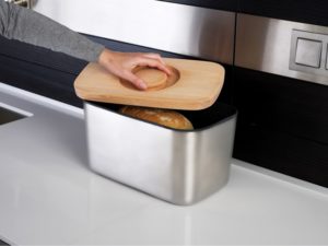 ブナ材を使用したフタ部分は円形の切り込みで開閉がしやすく、裏面はパン屑がちらばりにくい溝付きまな板となっています。ホームベーカリーで手作りしたパンや、お気に入りのパンの定位置として、キッチンをさらに美しく演出します。