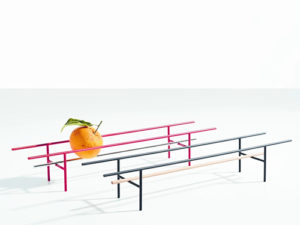 一般的なフルーツボウルのイメージや概念から遠く離れた姿が特徴的です。フレームで組まれた台にそれと同じ太さのバーが3本、平行になるように接続されただけ。何もない状態では構造の美しさを持ちながら、フルーツを乗せるとフルーツがサーカスの綱渡りのようにテーブルの上の主役になり、本体はある意味で脇役になっていきます。