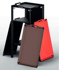 フリップは、2段式のキャスター付きテーブル/シェルフです。Flipという名前の通り、天板、棚板を跳ね上げることでスマートに折りたたむことができ、厚みは10cmほどに収まります。