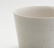 こちらは「ふぶき」と名付けられたカップです。磁器の粘土に細かい石を混ぜて作りました。器の内側はしんしんと降る雪、外側は削りを入れることで吹雪を表現しています。