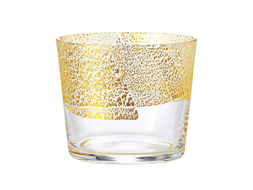 こちらは透明感あふれるガラスの器に金箔をあしらったグラスです。江戸硝子の技法を用いてハンドメイドでつくられています。グラス上部に金箔をあしらい、天空のイメージを表現しています。