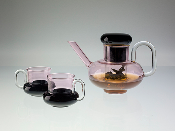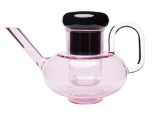 円錐と球、半透明と透明といった異なる要素を組み合わせることに焦点を当てたシリーズ「Bump」のティーポットです。ピンクと黒という大胆な配色でテーブルトップを華やかにします。実験器具などに使用されることが多いホウ酸ガラスを使用し、軽量かつ熱にも強いため、普段使いにも適しています。