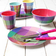 こちらはメラミンボウルです。使い勝手がよく、デイリーの食器としても重宝します。外側にはチェック柄、内側は単色のカラーの組み合わせです。軽くて割れにくいので毎日のヘビーユーズにも安心。重ねて持ち運びもできるので、ピクニックやキャンプなどのアウトドアでも活躍します。