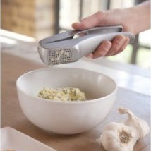 皮のついたままにんにくを入れて握るだけで絞れます。コンテナーが大きいので、大きめのにんにくでも絞れます。クリーニングツールが取っ手裏に収納されています。