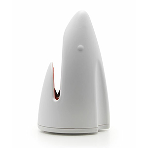 こちらはサメの形をしたユニークな包丁研ぎ器です。日本人にもなじみの深いサメの歯は、何にでも刺さるほどシャープに尖っています。しっかりと鼻の先を持って刃を研いでください。底には滑り止めがついており、安全面でも配慮されています。