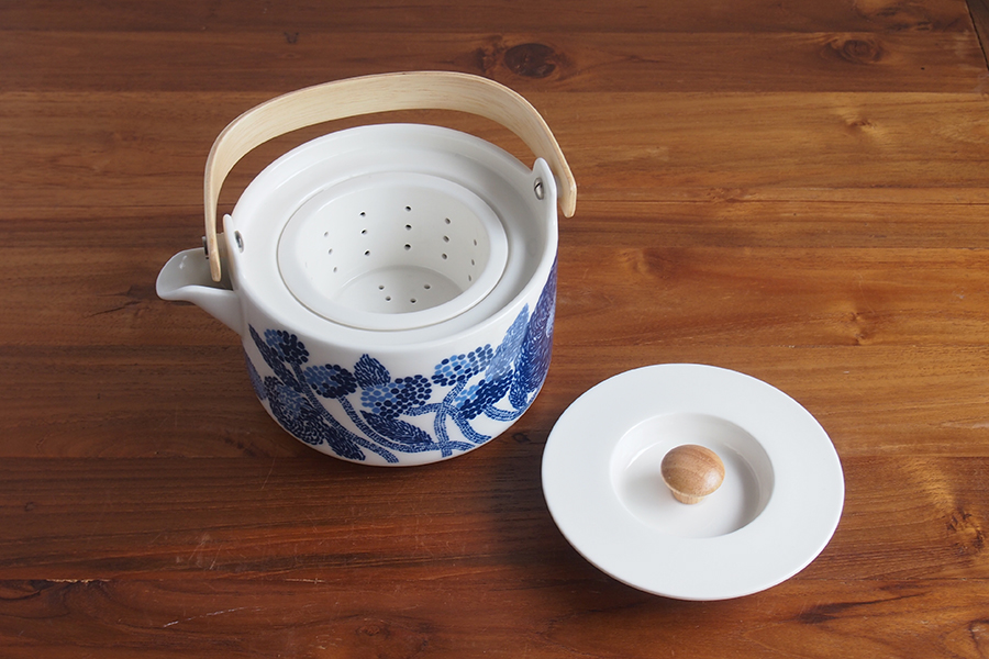 こちらはミンステリ柄のティーポットです。白木のハンドルが北欧らしさを感じさせるポットはキッチンに置いてあるだけでも絵になる存在。日本茶、紅茶、ウーロン茶、ハーブティーなど茶葉の開きを妨げず美味しいお茶を淹れることができ、茶こし付なので気軽にお茶時間を楽しめます。