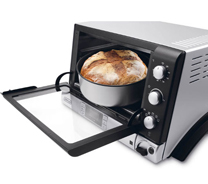 スクエアとサークルをあわせたスクエアクルデザインと、メタリックカラーの控えめな光沢が気品漂うオーブン&トースター。複雑な設定が必要ないダイヤル式で、オーブン、グリル、保温の3つの調理機能と、45分のタイマーにより幅広い料理が可能です。8.5Lのコンパクトなサイズながら、細かな温度設定やコントロールができ、トーストはもちろん、じっくりと火を通す本格オーブン料理やお菓子にも活躍。二重構造のドアと断熱構造で表面温度を低減し、安全性も向上しました。