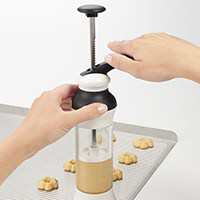 12種類ものディスク(クッキー型)が用意され、クッキー作りが楽しめるクッキープレスです。大きく持ちやすいレバーでたくさんのクッキー作りでも疲れにくく、滑りにくい底面によって生地を押し出す際にもしっかり安定します。カーブ状の本体は支えやすく、容器部分が透明なので生地の量も一目で確認可能です。本体は生地を入れる際やお手入れの際も簡単に取り外せて便利。保管に便利なディスクケース付きです。