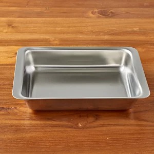 こちらはローストディッシュです。「18/10」のステンレスはとても軽量で劣化の心配がなく、汚れも落としやすく衛生的に使えます。巻き込みがない縁の仕上げや丸く仕上げられている四隅など、汚れがたまりにくく隅々まで洗えます。ラザニアやパンプキンパイなどの温かいメニューからゼリーなどの冷たいデザートまで幅広く活躍します。