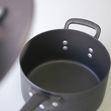 熱伝導のよいアルミは本来、焼き物や炒め物にはあまり適さない素材ですが、表面にフッ素樹脂加工をすることで、熱伝導のよさがプラスとなり、お料理が焦げつかず、すばやく仕上がります。すべすべとした塗膜なので、あと片付けもとても簡単です。