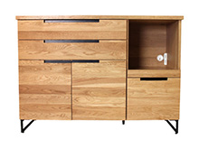 こちらはナチュラルなオーク無垢材と、黒塗装されたスチールを組み合わせたスプレムシリーズのカウンターボード。オーク材は色味を揃えずにあえてランダムにデザインされ、節目などもそのまま使用することにより、木の自然な表情が美しく表現されています。脚や取っ手部分の無機質なブラックスチールが全体を引き締めています。