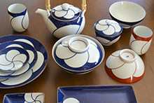 こちらは2011年グッドデザイン・ロングライフ賞受賞のシリーズです。どれも磁器の美しさが素晴らしく、とても薄くて軽く、持ちやすい形が考え抜かれています。伝統的な技法「手濃み(てだみ)」の技法を活かし、梅の紋を大胆にアレンジしました。際立つ青の美しさは濃み筆を使って、呉須絵具を丹念に染めていくことで実現しました。