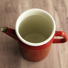 こちらはドリップポットです。ポットの上まで目一杯水を入れてもほとんど水がこぼれる事のない構造で、取っ手が本体から少し開いている事により、注湯時に無理なく回転させ注ぐ事が出来ます。