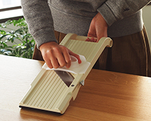 滑り止めが付いたことで、力を入れてスライスしても安定感が抜群で大量のスライスも楽にこなせます。また、ひっかけ足の窪みをボウルの縁にかけて使えば、スライスした野菜をそのまま調理でき便利です。