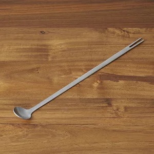 細長いハンドルの左右に味見用のスプーンと食材の煮え具合などを確認するフォークが付いた味見スプーン。小ぶりの味見スプーンは鍋の中に鎮めるだけで汁をすくえる角度になっていて、持ち手が長いから深鍋に使っても手に熱が伝わりにくい仕様です。