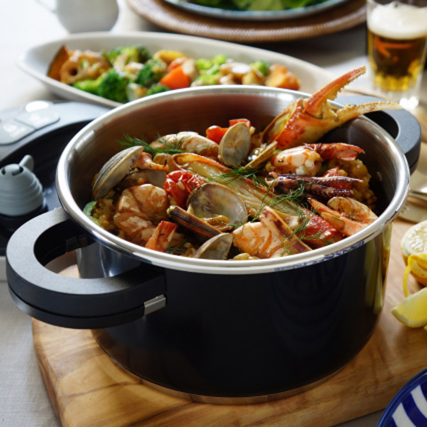 オースプラスはドイツでデザインされた、スタイリッシュな圧力鍋です。調理後、そのままテーブルに出しても華やかです。