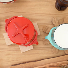 クロスの形をしたつまみは、まさに北欧デザイン。鍋敷きにもなる機能性が魅力です。フタの上に載せ、重ねて収納できます。