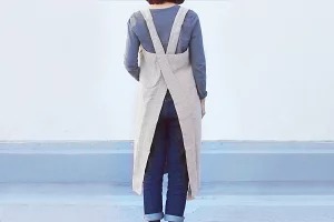 ピナフォアとは英語でエプロンドレスという意味。名前の通り、このエプロンは頭からかぶって着脱するタイプのデザインで、紐を結びつけるタイプよりも首への負担が少ないです。また、背中部分にボタンなどはなく、肩ひもがクロスする形になるため、作業中に肩ひもがずり落ちてくる心配もありません。