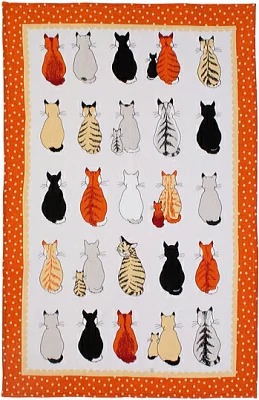 こちらはcats in waiting(待っている猫たち)という柄のティータオルです。猫たちが待っている後ろ姿がとても可愛らしく描かれています。一匹だけが後方をを向いて笑っているユーモラスなデザインです。
