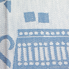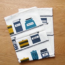 こちらはキッチンクロスです。生地はタテ糸に細めの、ヨコ糸に太めの生成り糸と色糸を使ったナチュラルな雰囲気。コットンとリネンの素材感を活かしながら、複雑な柄が二重織ジャガードとなっています。