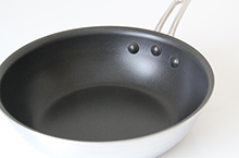 熱伝導のよいアルミは本来、焼き物や炒め物にはあまり適さない素材ですが、表面にフッ素樹脂加工をすることで、熱伝導のよさがプラスとなり、お料理が焦げつかず、すばやく仕上がります。すべすべとした塗膜なので、あと片付けもとても簡単です。