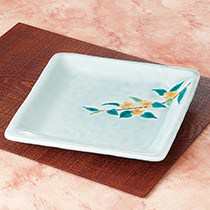 こちらは角盛皿です。石川県能美市にある文吉窯の作品で、日常使いのシンプルな器をモットーとしたものが主体です。この角盛皿は淡い青色に山吹がひと枝描かれた印象的な柄です。和食だけではなく、洋食の盛り付けにも似合いそうです。