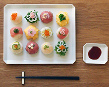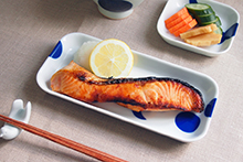 有田焼ならではの美しいブルーと密かに輝くシルバーの水玉模様。このシリーズは小泉誠さんがデザインした器に佐藤晃一さんが絵付けを施しています。白磁に浮き立つ水玉模様は神秘的な月の満ち欠けを連想させます。長角皿(小)は、温野菜サラダ、魚介のマリネ、巻き寿司を盛り付けても素敵です。白磁シリーズと組み合わせたり、長角皿(大)や角皿と組み合わせたり、スクエア型ならではのアレンジの広さが特徴です。