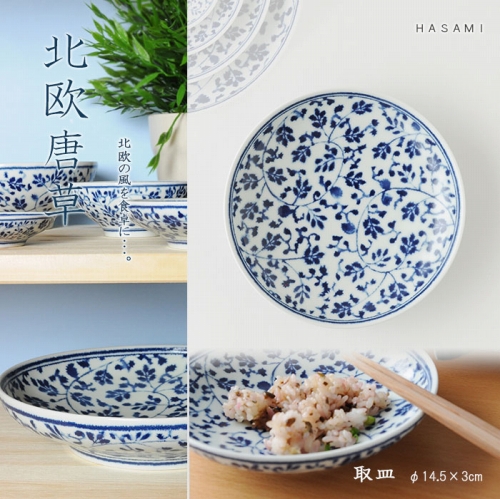 こちらの北欧唐草は、伝統柄の唐草を現代風にアレンジし、和食器でありながら「北欧」を感じられる器をコンセプトに創り出されたシリーズです。白地に藍色がとても美しい食器です。