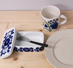 市販のバターがすっきりと収まるバターケースです。ケースには可愛らしい花々が咲いています。北欧っぽいイメージなのでティーマなどの北欧食器と相性も良さそうです。バター以外にもクッキーなどのお菓子を入れても。いつまでも眺めていたい可愛らしさです。なお、バターナイフを収納するくぼみはありません。