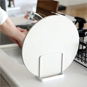 こちらのサークル型は、通常のドライングプレートとして利用できるのはもちろん、お鍋やボウルなど四角いプレートに置きにくかったアイテムをスッキリ置くことが出来ます。また、使い終わったコンロのゴトクを利用してお鍋を乾かすスペースが出来る画期的な発想です。