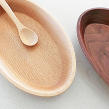 こちらはシンプルなデザインが人気のカレー・パスタ皿です。木製独特のあたたかな存在感があり手に取るたびに木のやさしい風合いを楽しむことができます。表面は抗菌ウレタン塗装を施してあるので、水気のあるものを乗せることが出来ます。高さが他のお皿よりあるのでサラダなどにもお使いいただけます。