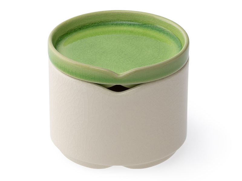 こちらは「白貫入」の小鉢に「緑貫入」の蓋を組み合わせた蓋付小鉢です。料理を小分けにして出すのに丁度よい小さめサイズ。縁のくぼみにはスプーンなどを置くことができ、差したまま重ねることもできます。くぼみを使用しない際は、ずらして重ねることでくぼみを閉じた状態にすることも可能です。蓋部分は外して小皿としてもお使いいただけます。