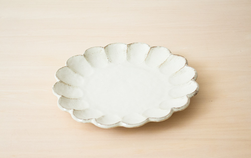 菊の花をイメージした8寸皿。どんなお料理を盛ろうかと考えるのが楽しくなる器です。