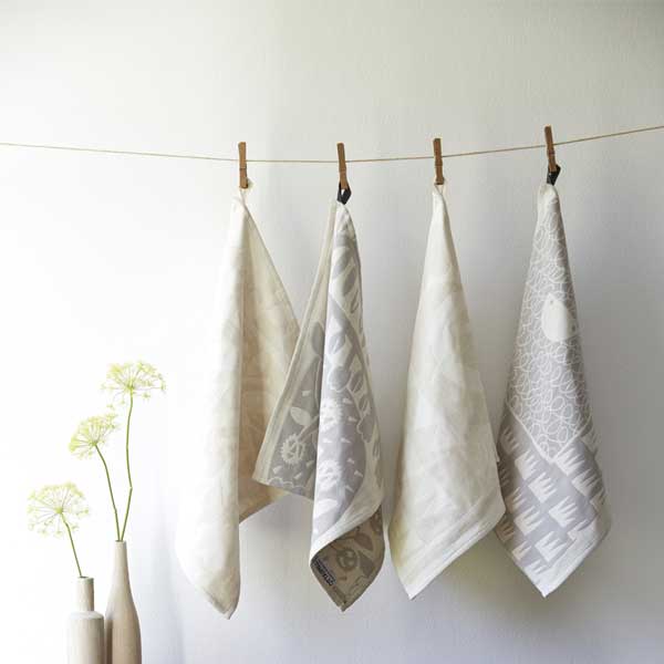 こちらはキッチンクロスです。生地はタテ糸に細めの、ヨコ糸に太めの生成り糸と色糸を使ったナチュラルな雰囲気。コットンとリネンの素材感を活かしながら、複雑な柄が二重織ジャガードとなっています。
