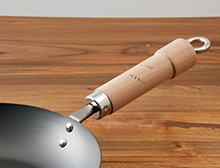 - 材質: 本体/冷間圧延磨き鋼版(板厚1.6mm)、鍋の表面仕上げ/特殊熱処理(窒化鉄)、ハンドル/天然木