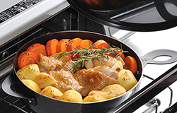 こちらはグリルダッチオーブンです。短時間で高温になる魚焼きグリルを使って、おうちで手軽にダッチオーブン料理が楽しめます。一般的な鉄鋳物製のダッチオーブンに比べて軽く、家庭でも手軽に楽しめる扱いやすい形。補助ハンドル付きで持ちやすい形です。