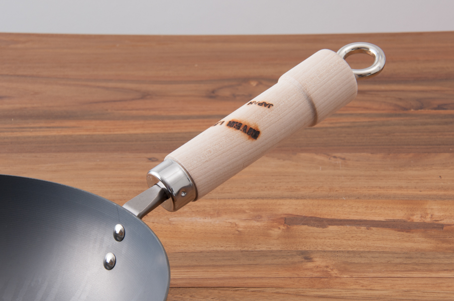 - 材質: 本体/冷間圧延磨き鋼版(板厚=1.6mm)、鍋の表面仕上げ/特殊熱処理(窒化鉄)、ハンドル/天然木