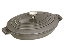 こちらはシャスールのサービングキャセロールです。鋳鉄・ホーロー製で、柔らかいパステルカラーを基調としているのが特徴です。ふたも本体もしっかりした重さと厚みがあるので、水分の揮発が少なく、保温性も抜群です。食材の水分・エッセンスを十分活かすので、おいしくふっくら仕上がります。すき焼きからパエリア、お肉のソテーなど、浅型モデルは、パーティーなどでも大活躍します。
