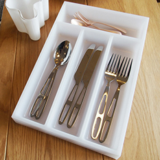 こちらはシンプルなデザインにも使い易さをイメージしたフォルムのカトラリートレーです。サイズは、22.5×33.5×4.8cmの使いやすい大きさとなっており、食器棚などの抽斗にも汎用性が高く、使い勝手の良いトレーです。スプーンやフォーク、ナイフ、箸などを綺麗に整理整頓できるシンプルなカトラリートレーです。外国産が多い中、国産にこだわったアイテムです。