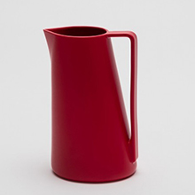 こちらは直線のシャープな印象が特徴的なピッチャーです。デザイナーの藤城成貴は400年に渡る有田焼の歴史を探求し、赤い色の優位性を発見しました。有田では上絵付けのことを赤絵と呼び、昔から特別な色として使われてきましたが、彼はこの赤に着目し、その色を中心にしたデザイン開発を行いました。