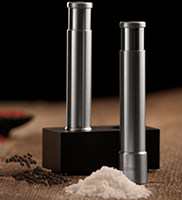 ステンレスの佇まいにがウッドの台座に2本並ぶ、ソルト&ペッパーミルTwinsです。特徴的なのは親指でプッシュすることで、片手で簡単に挽けるということです。従来の両手が必要なミルと比べると手軽に使えます。ソルト、ペッパーそれぞれに適した刃の形状となっているので、品質の面でも妥協はありません。ビーチウッドの台により、テーブルを汚さず、すっきりと収納できます。