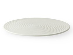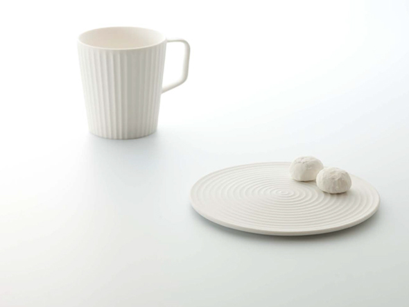 こちらは玉砂利の曲線の紋様を表現した「えん」のタイプ。艶と色のない器は柔らかな陰影を生み出し、食卓に静謐な空間と安らかな時間を演出します。
