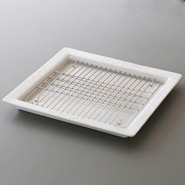 適度な深さがあるので、網を外してワンプレートディッシュとして使ったり、いろいろなシーンで役立ちます。シンプルホワイトだから和洋問わず、どんな食材、お料理を盛り付けても似合います。