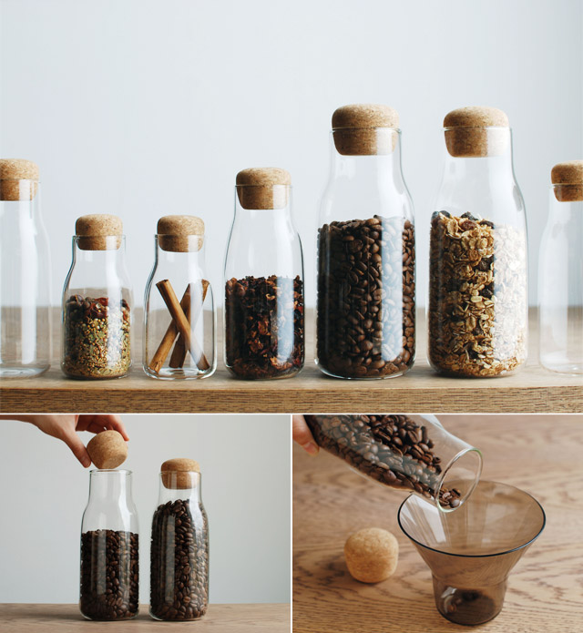 耐熱ガラスと丸いコルクを組み合わせたボトル型のキャニスター、ボトリット。