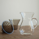 コーヒーカラフェにブリューワーと圧着部分を折ったペーパーフィルタをセットし、ドリップするだけ。カラフェには容量(300ml、600ml)の目安になる目盛り付きです。付属のホルダーは使用後のフィルター置きになるほか、コーヒー豆を量る目安となる目盛りがついています。