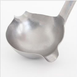 こちらは小さなサイズのレードルです。一見アルミに見えますが、実は錆にも強く 臭いも付きにくいステンレスを使用しています。小さめなので、お鍋時などにテーブルに置きやすいサイズです。丈夫で飽きのこないデザインと、右利き左利き両方の方に使い易い両口レードルは、引っ越し祝いや結婚祝いにもおすすめな商品です。